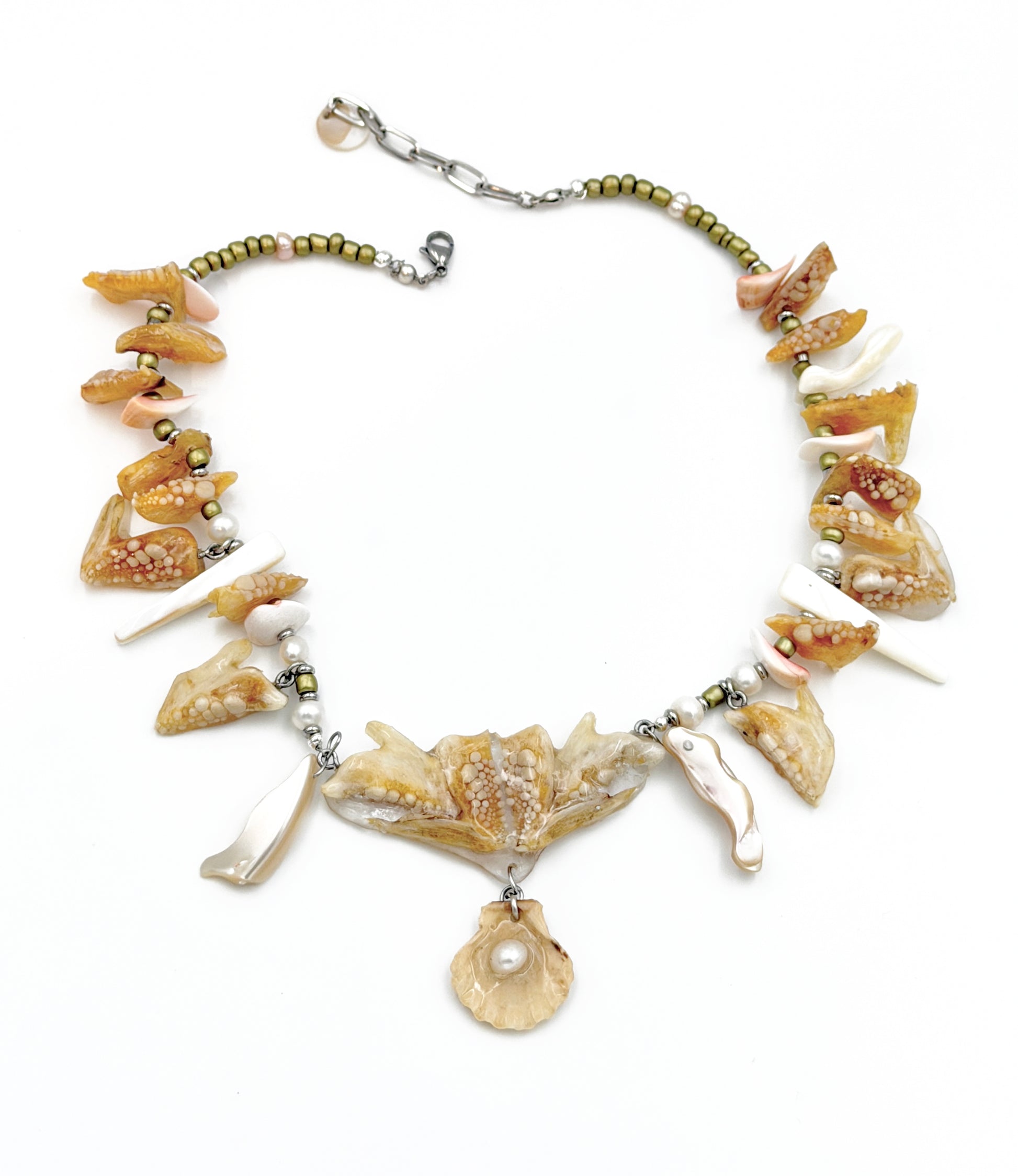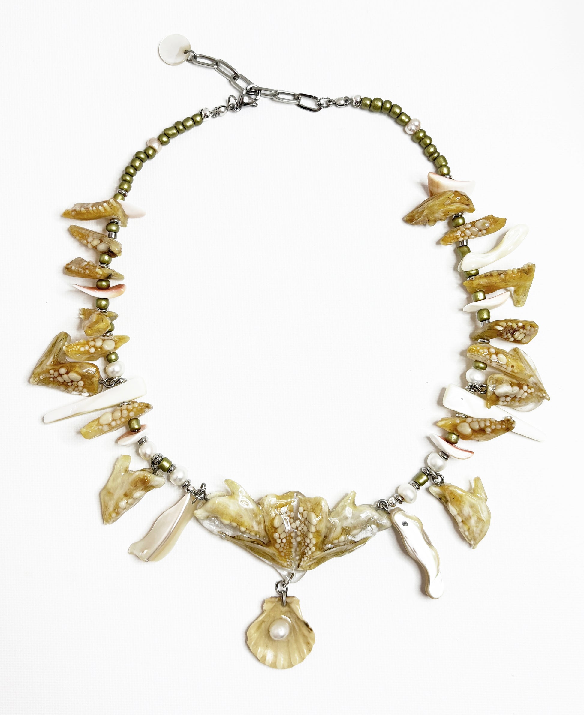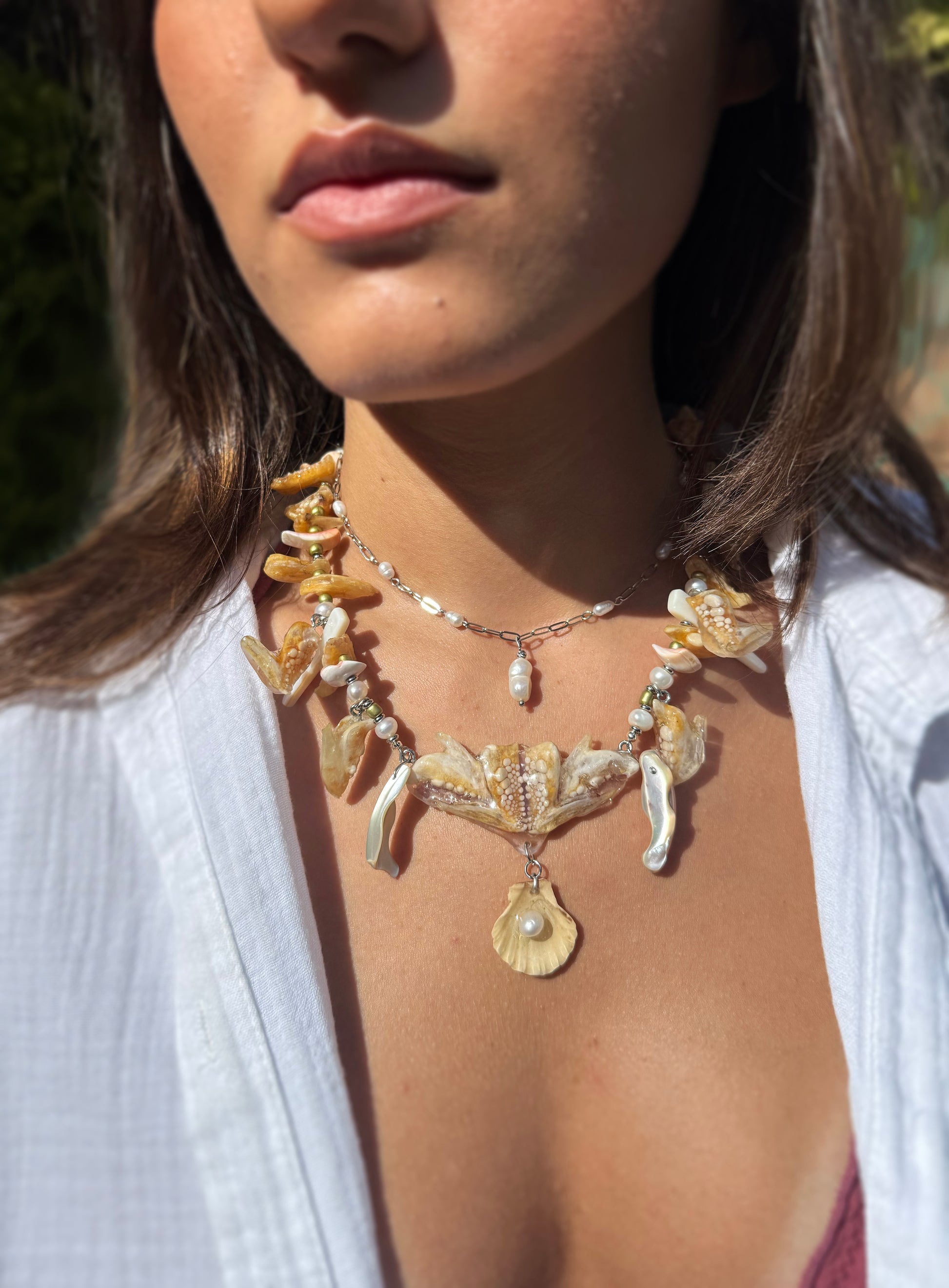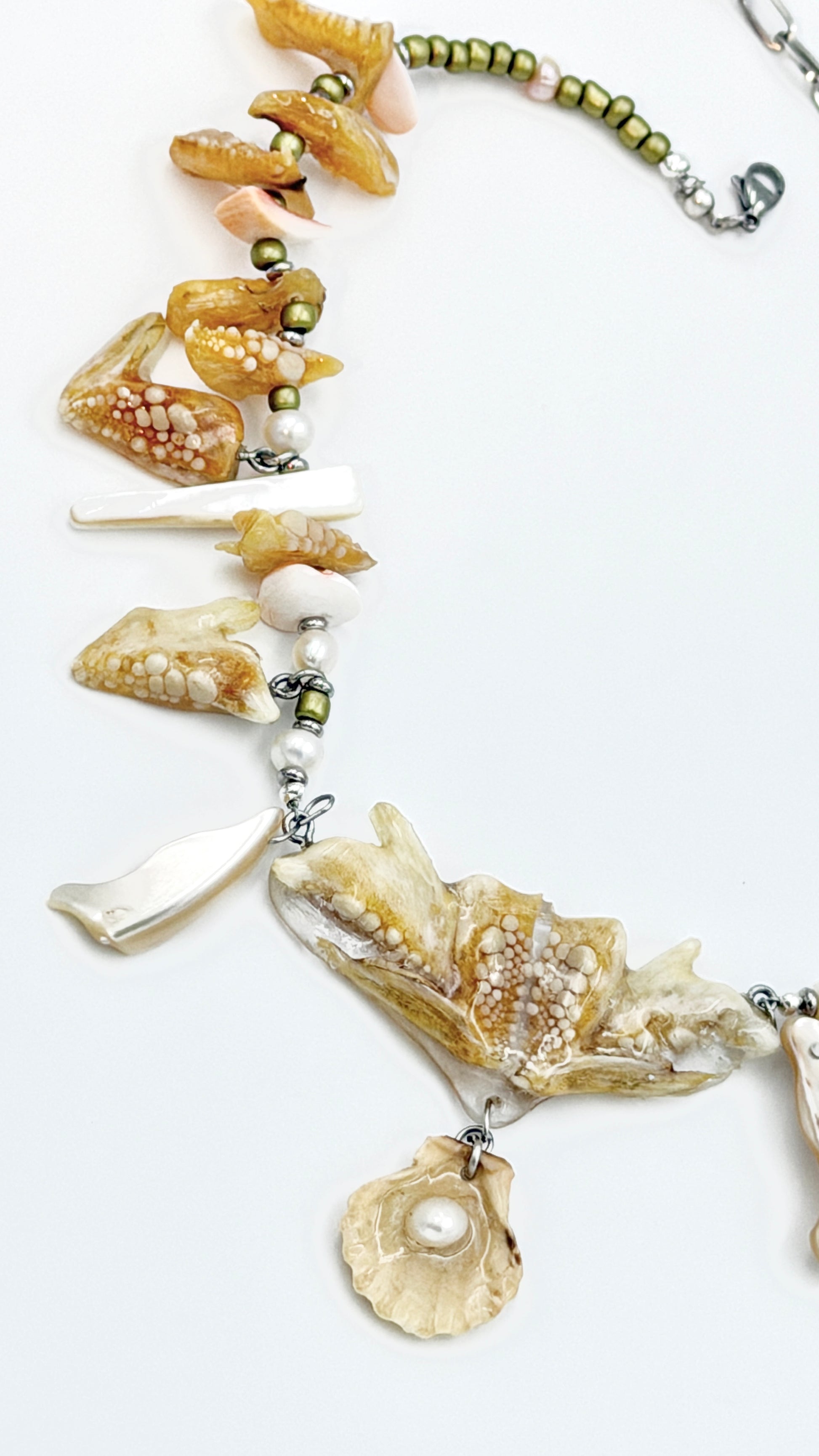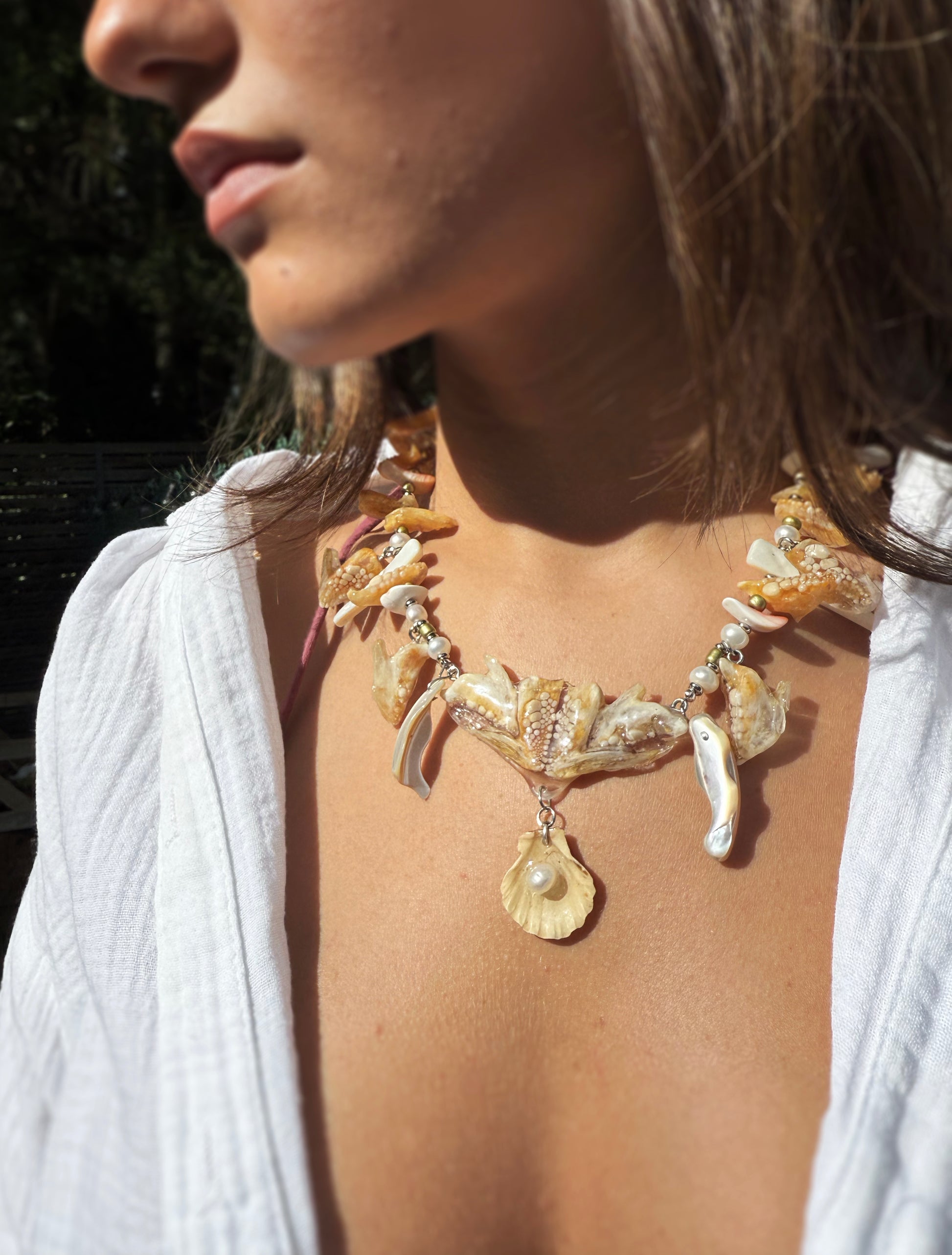 This unique, one of a kind piece features jawbones from the sea-bream fish (çipura), carefully preserved in resin to highlight their natural beauty. Complemented by freshwater pearls, mother-of-pearl, seashells, and glass beads, it captures the elegance of oceanic elements. All metal components are crafted from stainless steel, ensuring both durability and a refined finish.