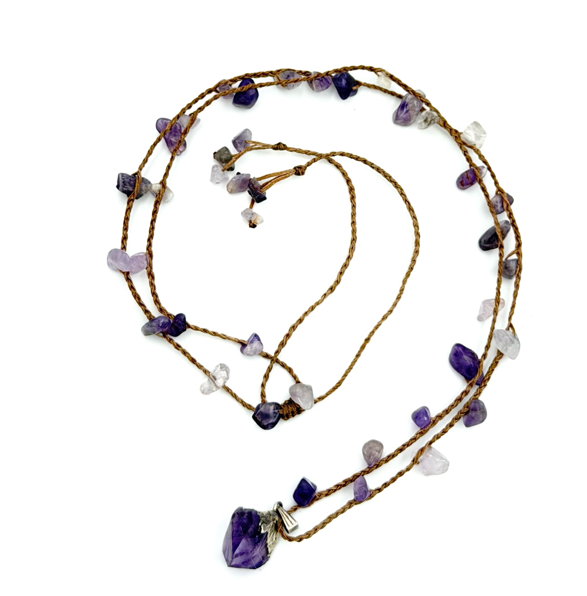 Macrome necklaces with natural amethyst nugget gemstones with adjustable cord
