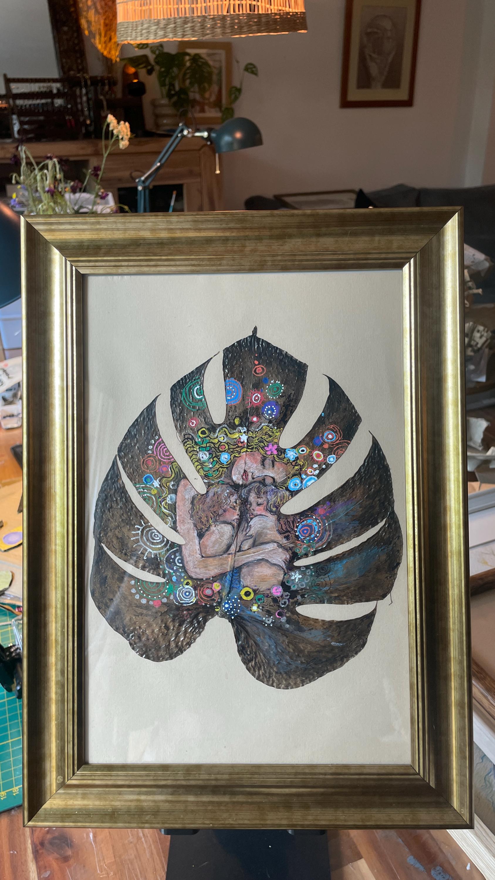 Mother & Child by Klimt - Hand-Painted on Natural Monstera Leaf Canvas