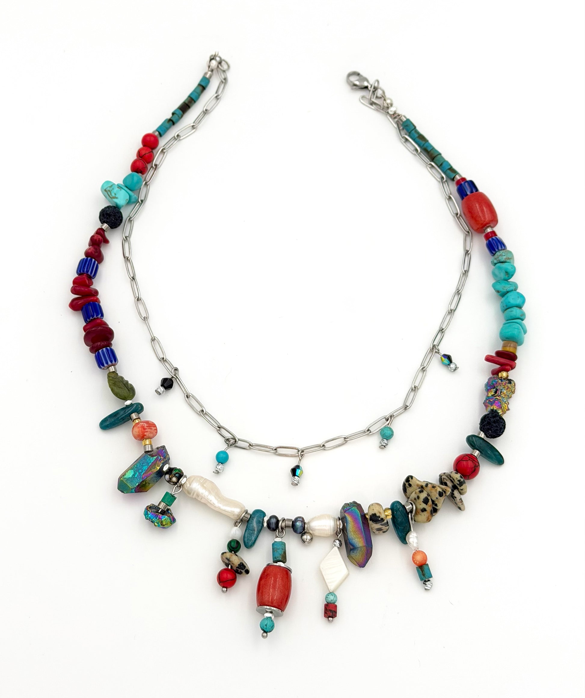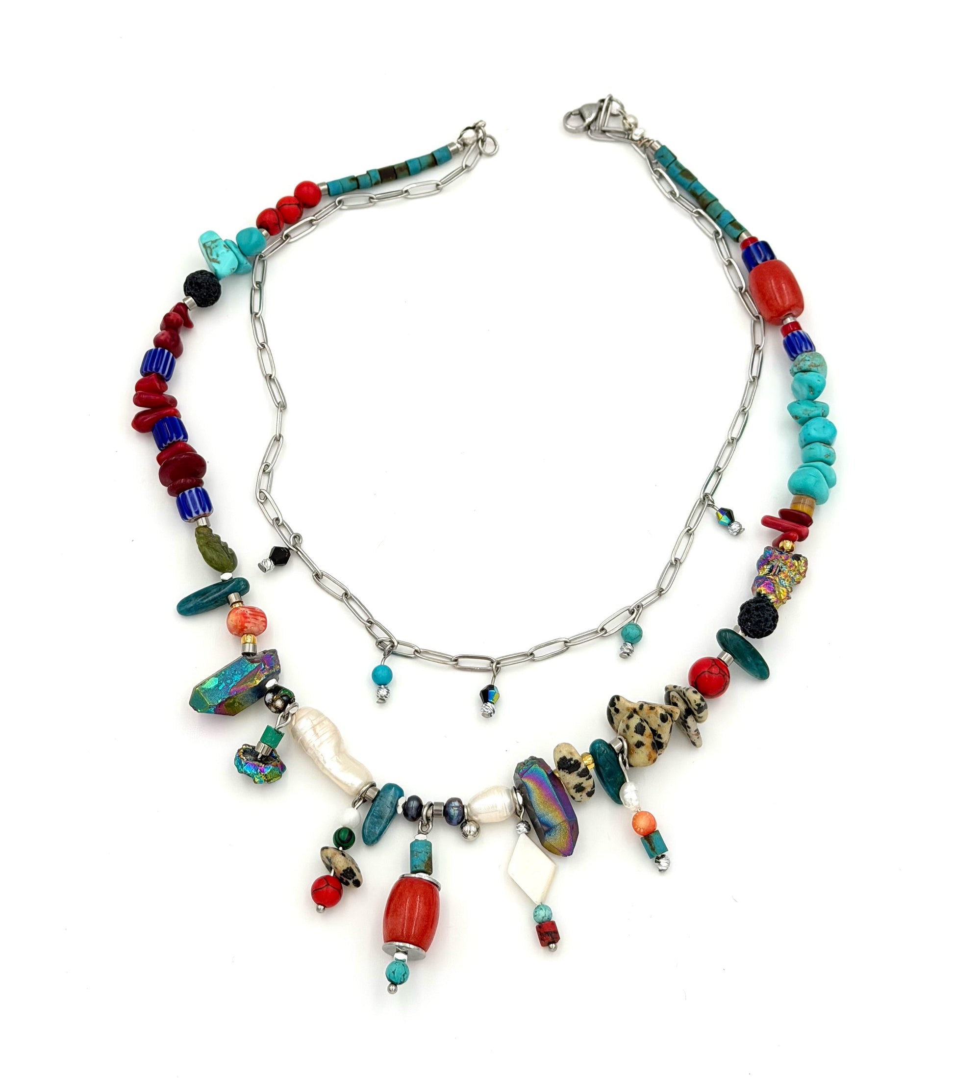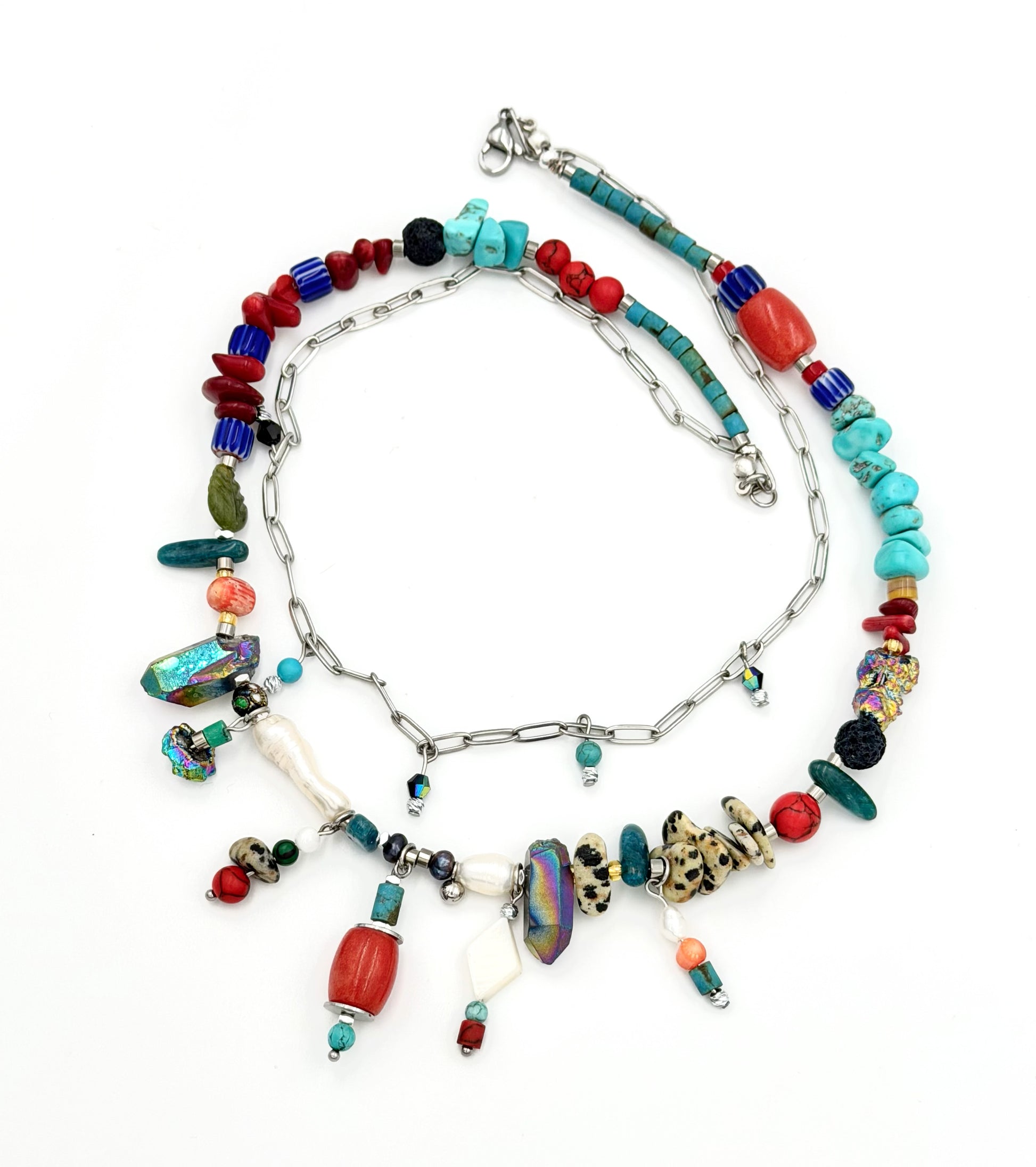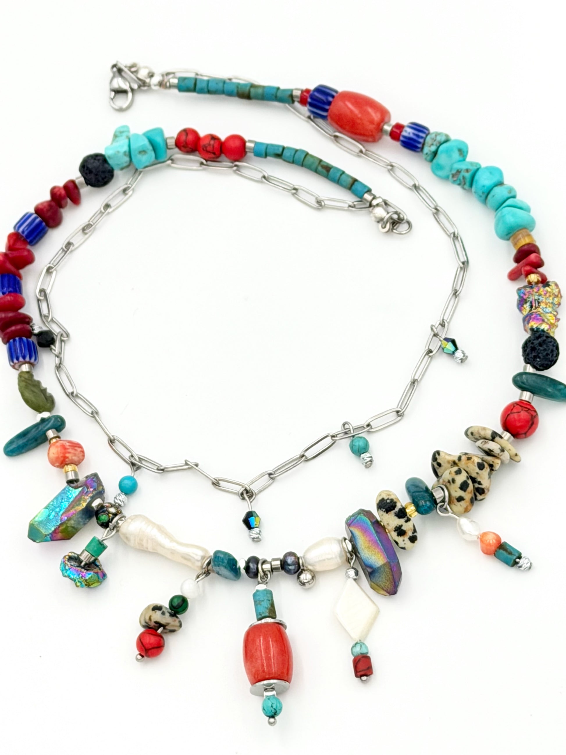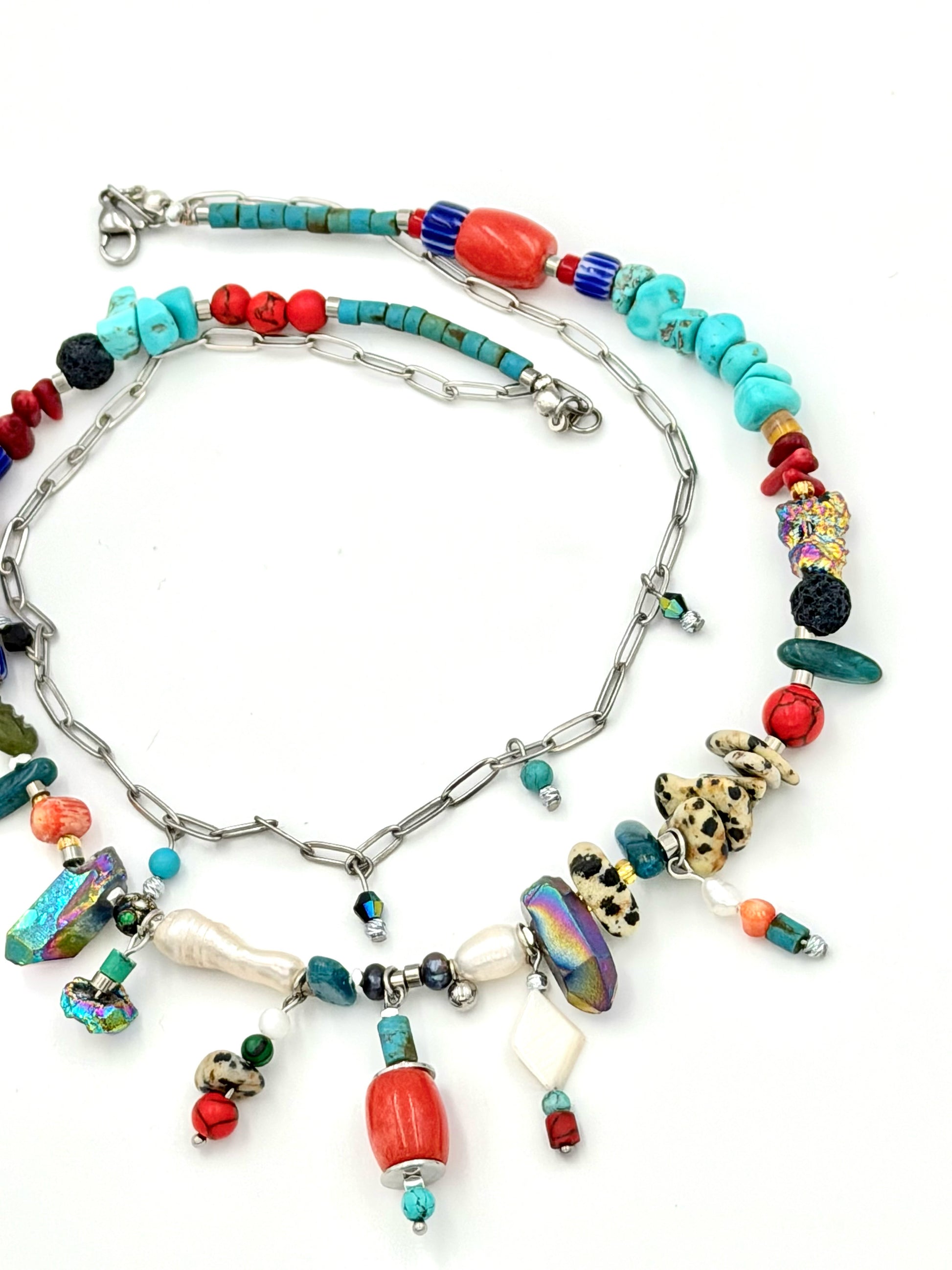 Koral, turquoise, dalmatian stone, apatite, pearl, jade, red and green malachite, lava stone, jadeite, hand made glass beads