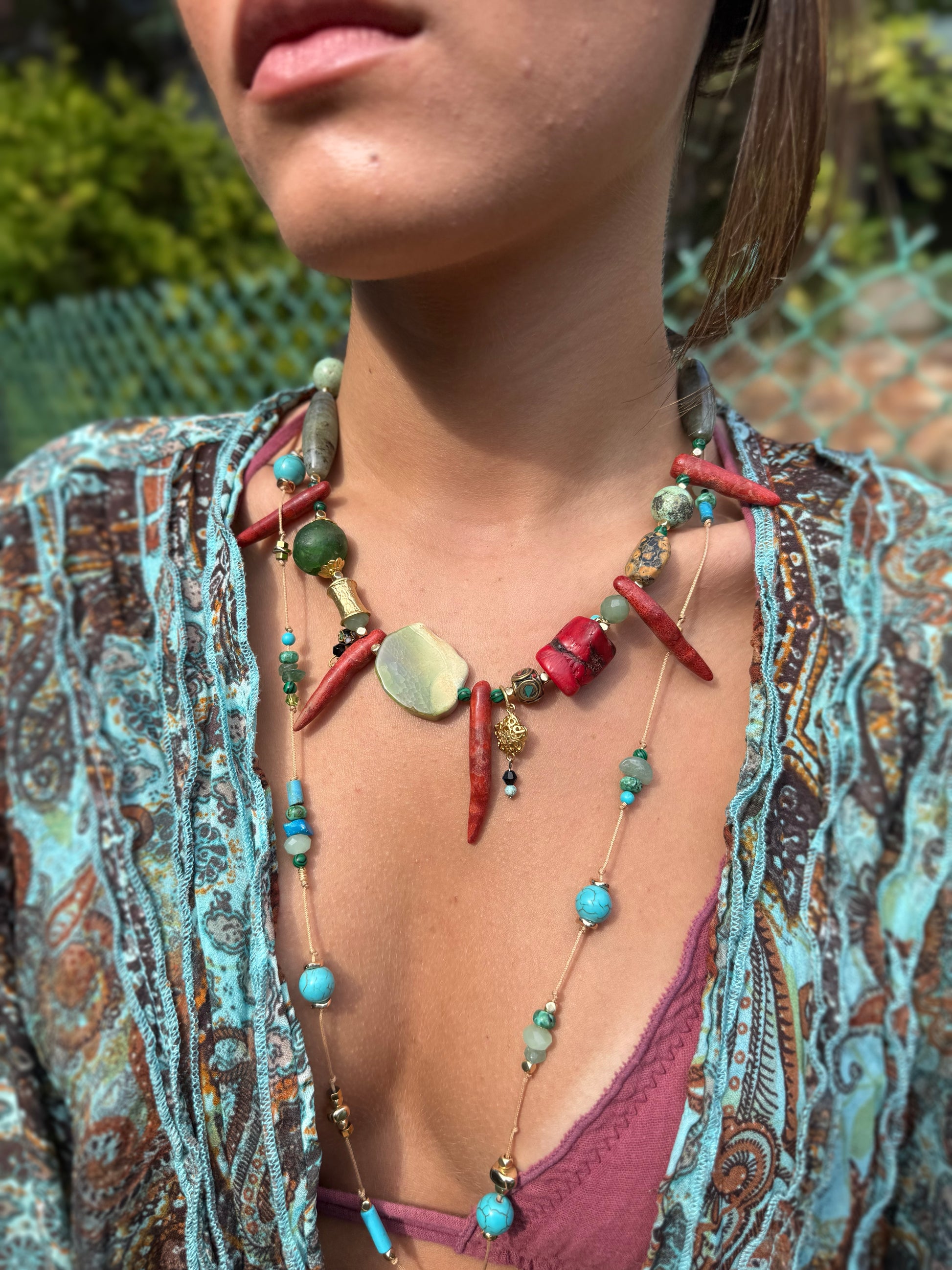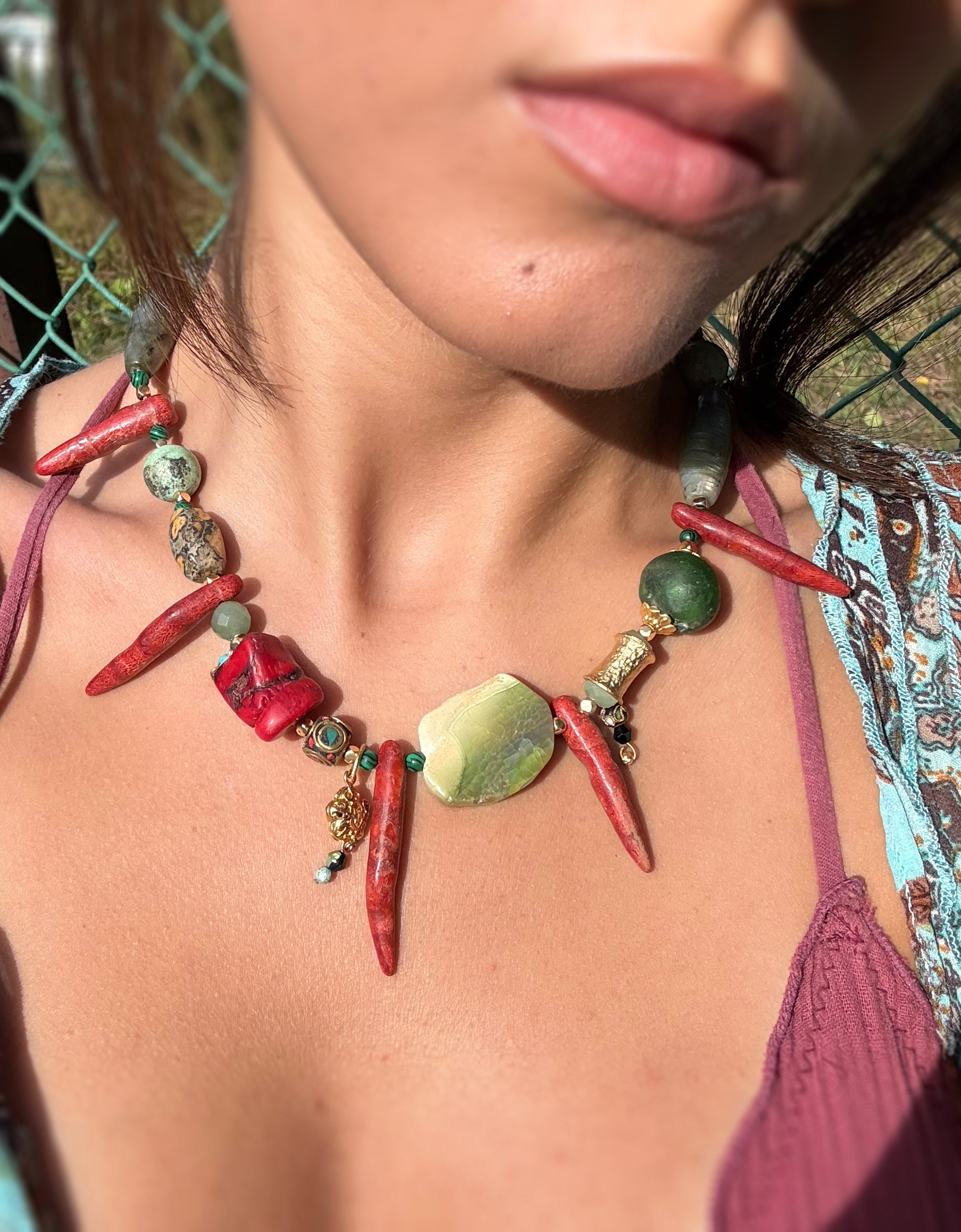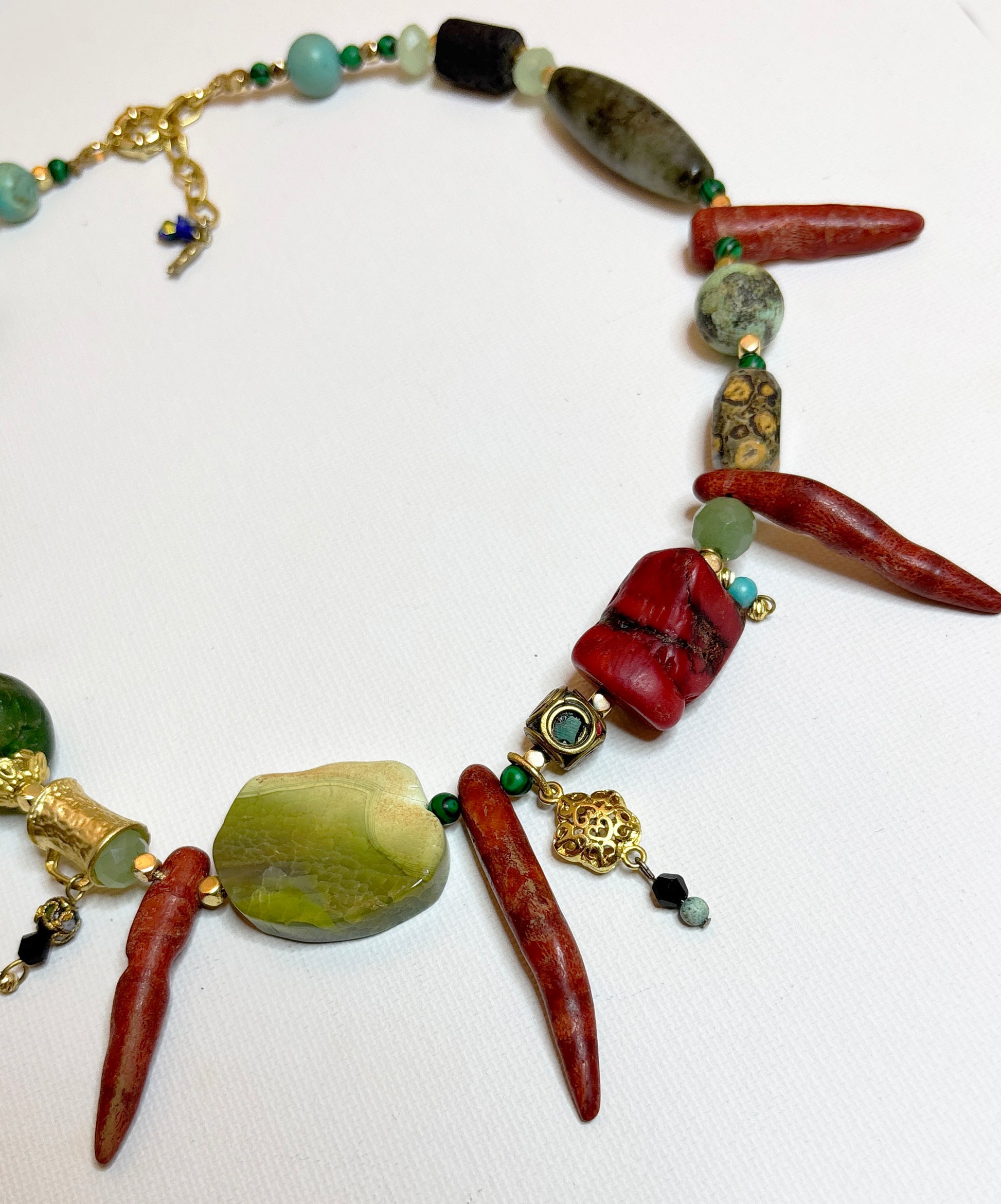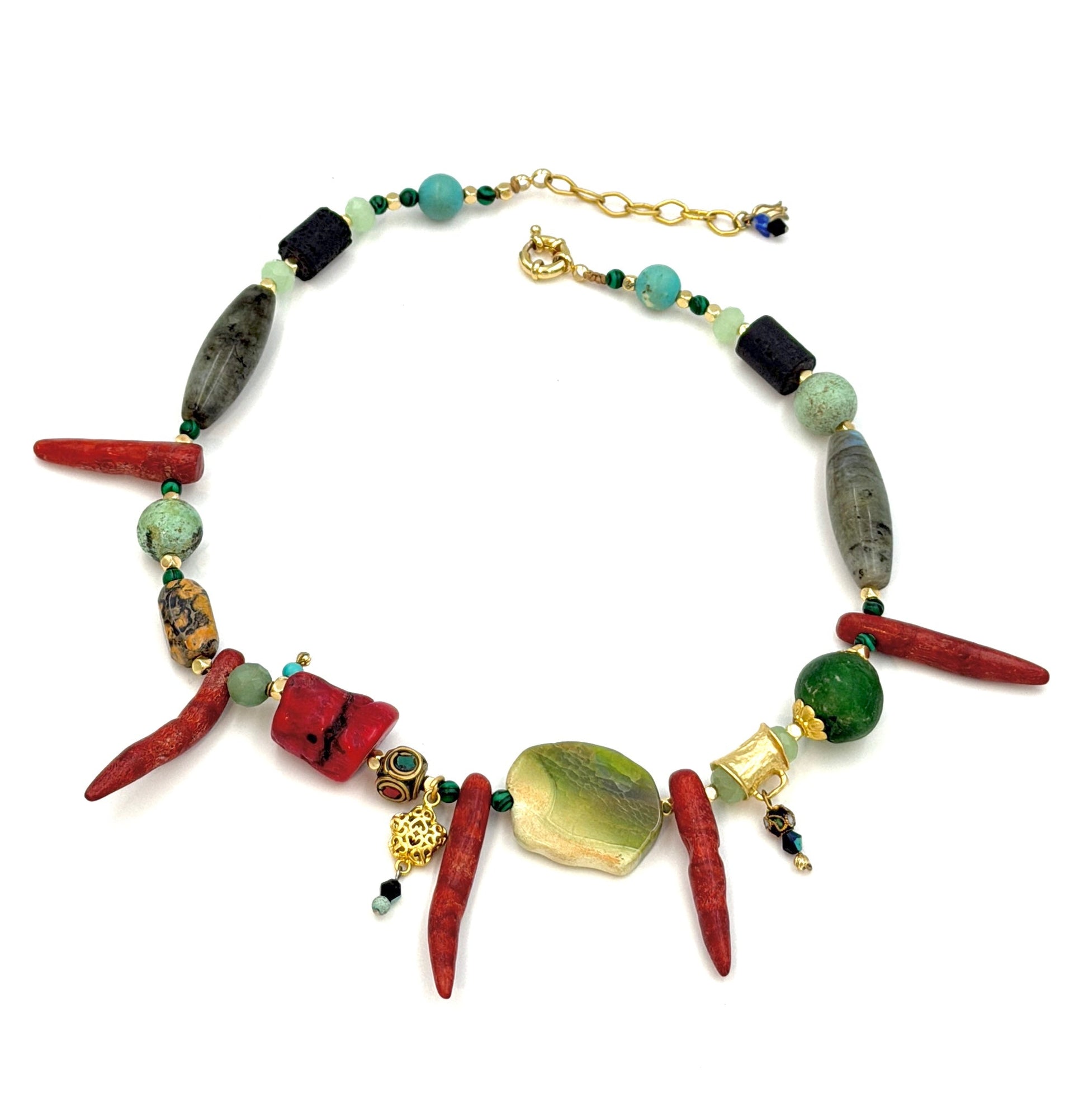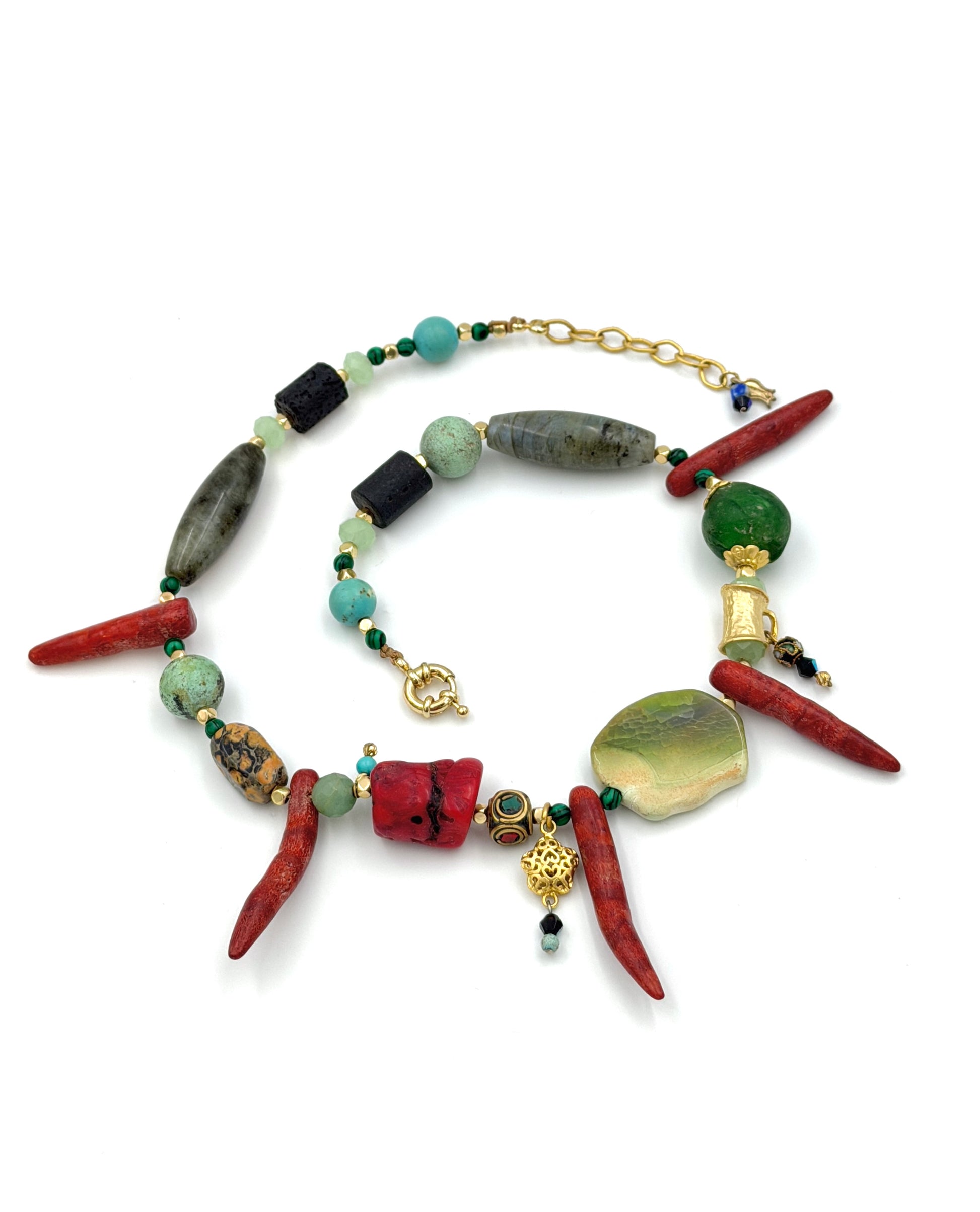 Koral, turquoise, jade, jasper leopard skin, labradorite, red and green malachite, lava stone, aventurine