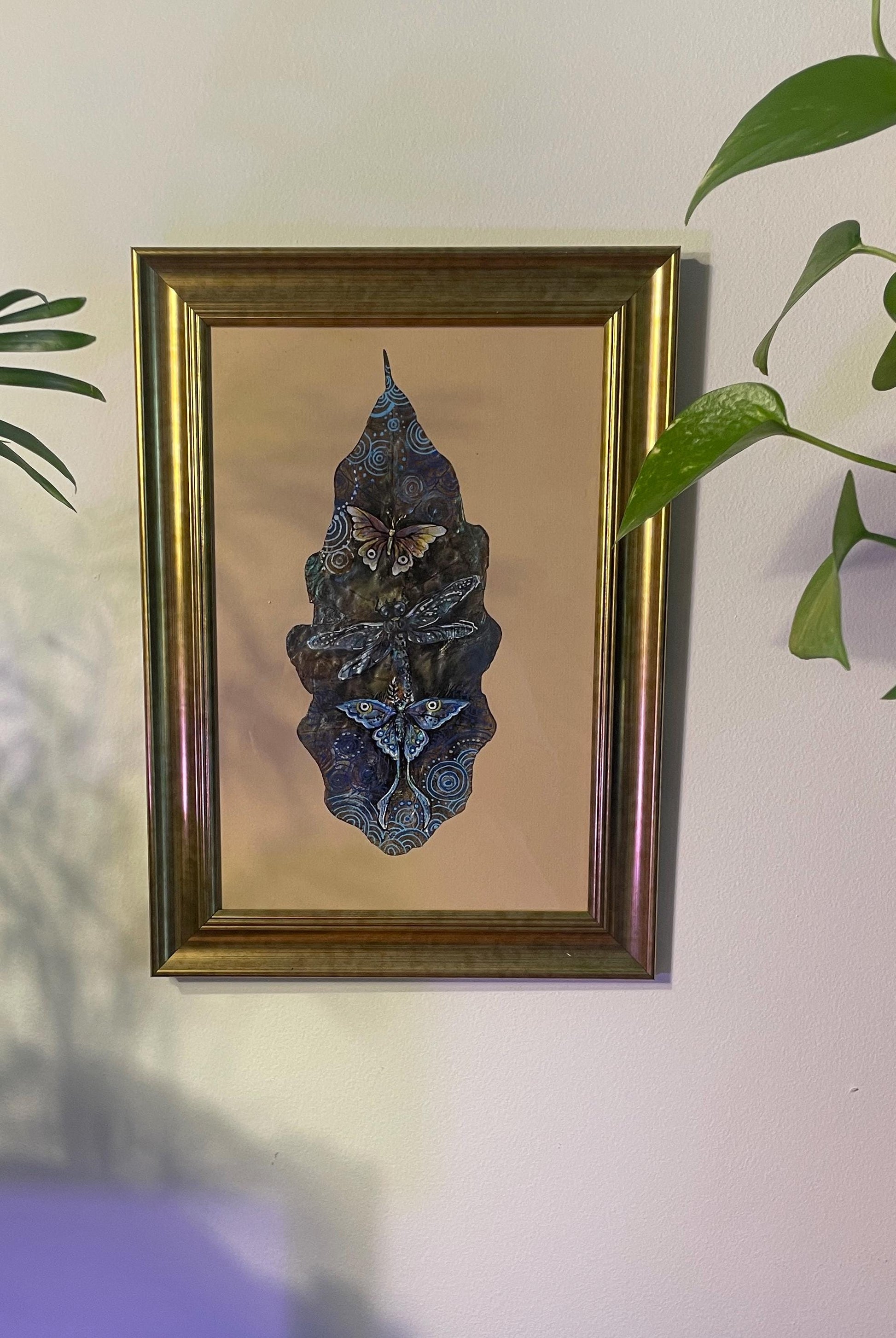 This artwork is an original hand-painted piece—not a print. It was created on a naturally dried leaf that I personally prepared, using a mix of watercolor, acrylic, and fineliner pens. Each leaf is carefully selected and painted by hand, making every piece truly one of a kind. * Materials: Watercolor, acrylic, fineliner * Leaf size: approx. 24,5 cm x 11 cm * Frame size: 30 cm x 20 cm * Artwork: Original drawing * Canvas: Real dried leaf, preserved and painted with care This piece blends the elegance of fine art with the organic beauty of nature, making it a meaningful and eye-catching addition to any space.