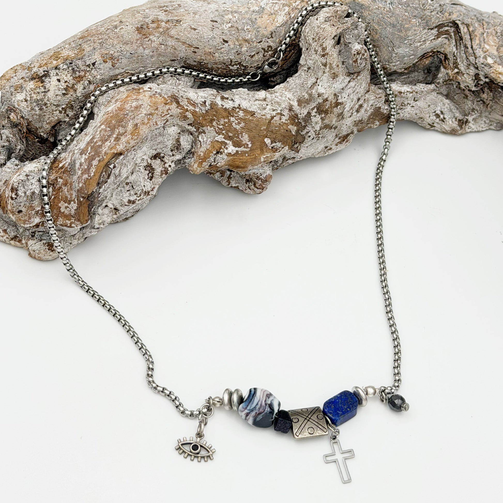 ✤ Materials: Stainless steel chain and beads, handmade glass bead, lapis lazuli, hematite