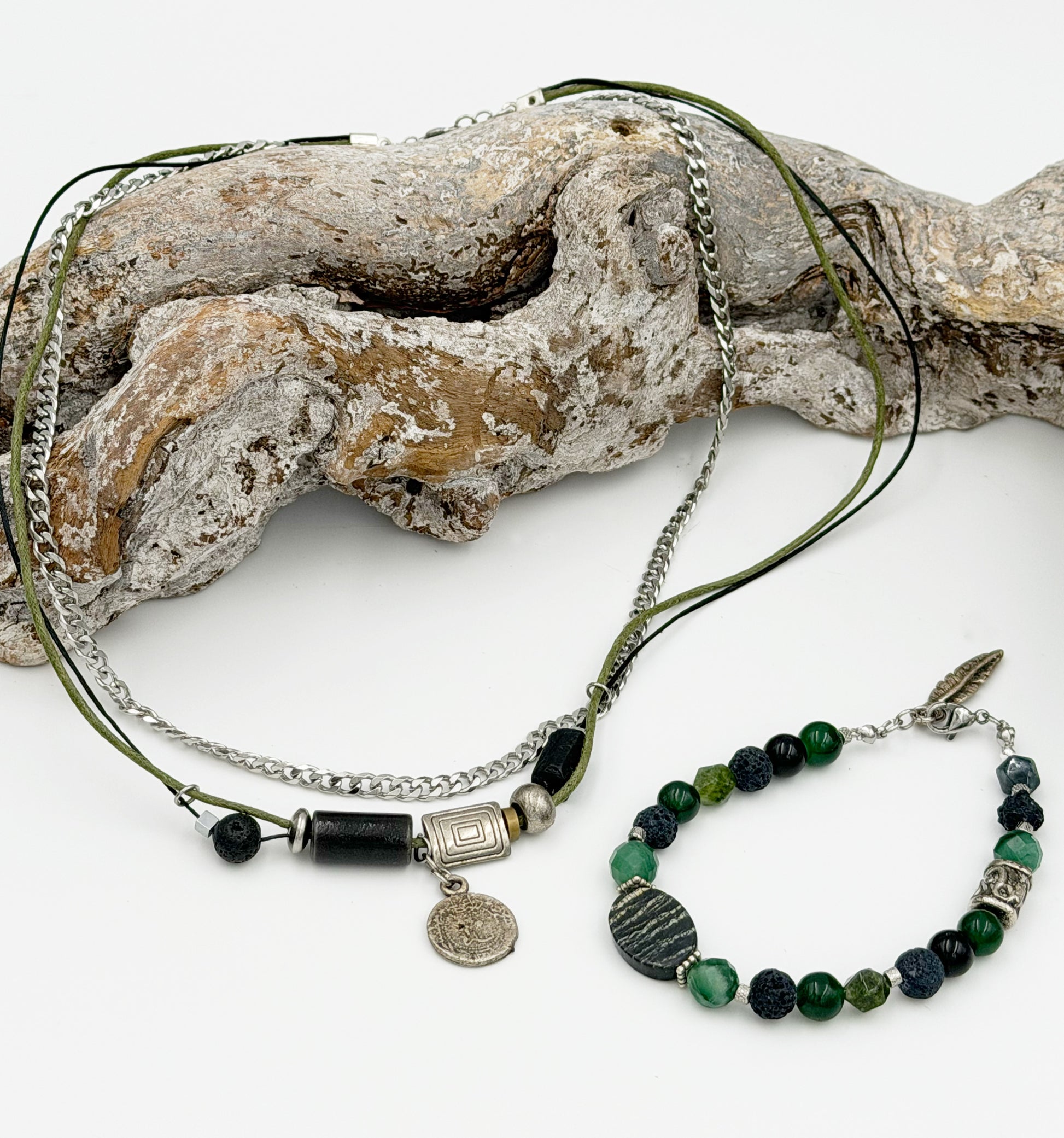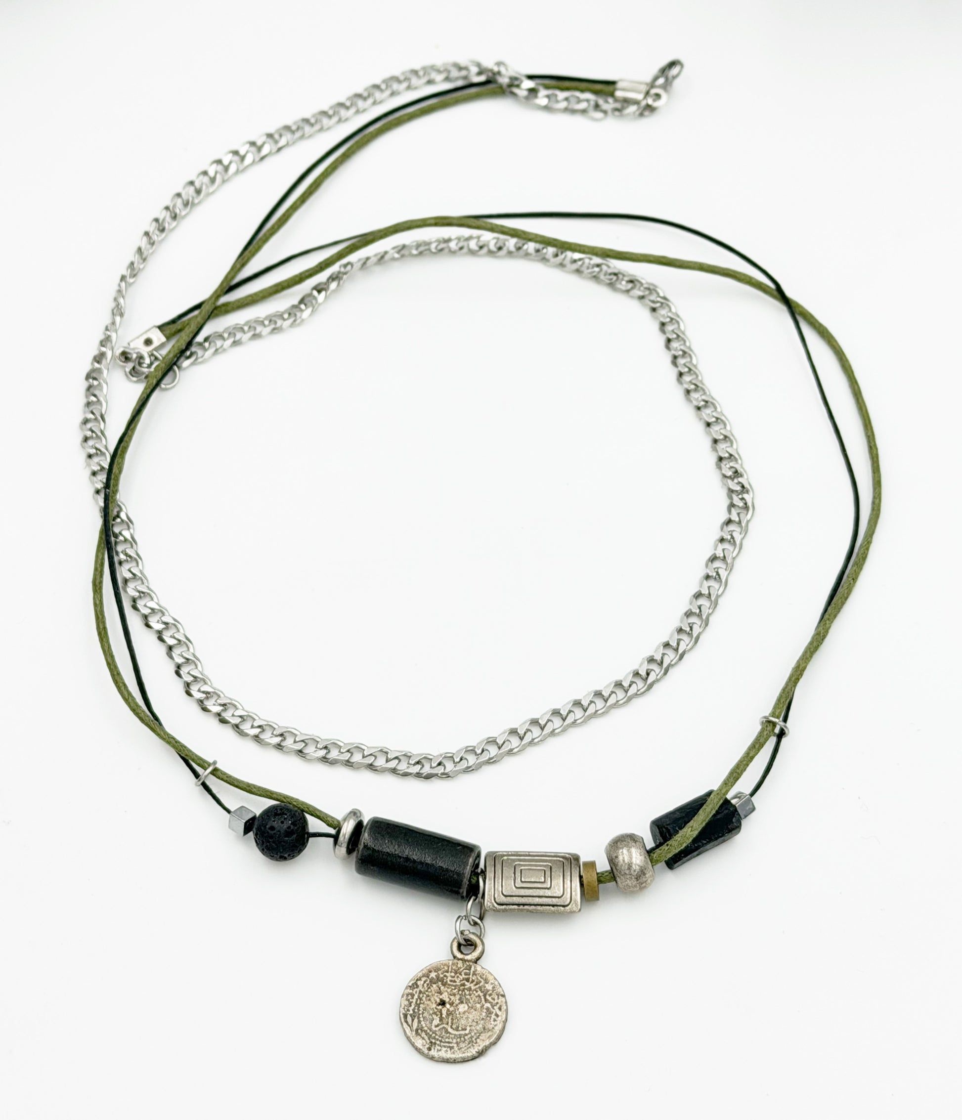✤ Materials: Stainless steel, vintage-style silver-plated brass pendant, tourmaline, ceramic bead