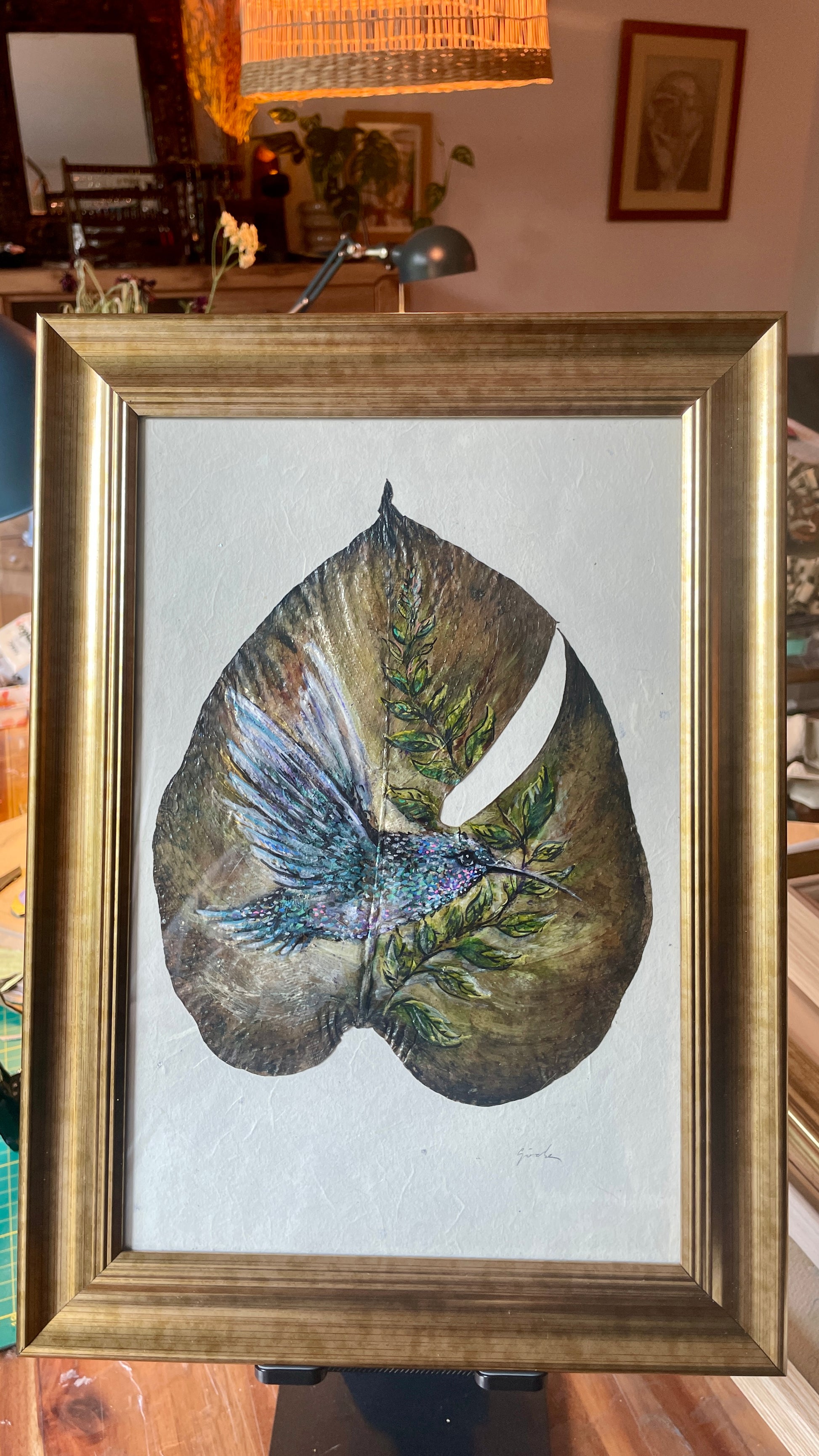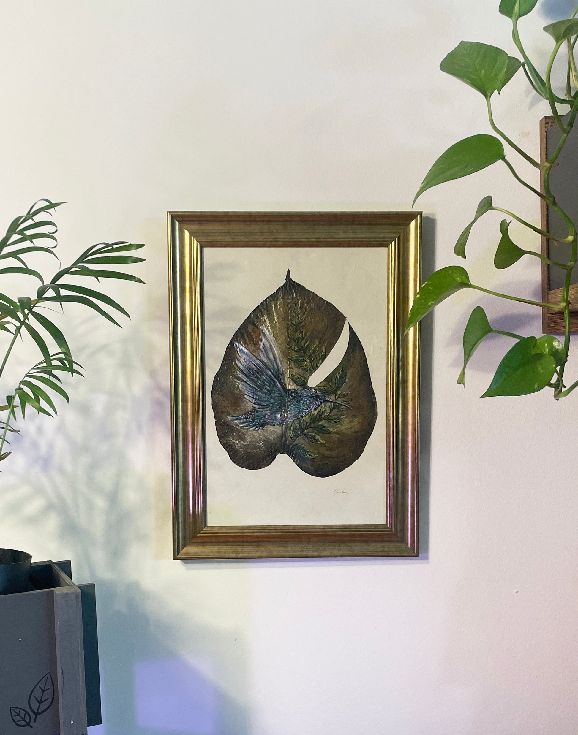 - Canvas: Real dried monstera leaf, preserved and painted