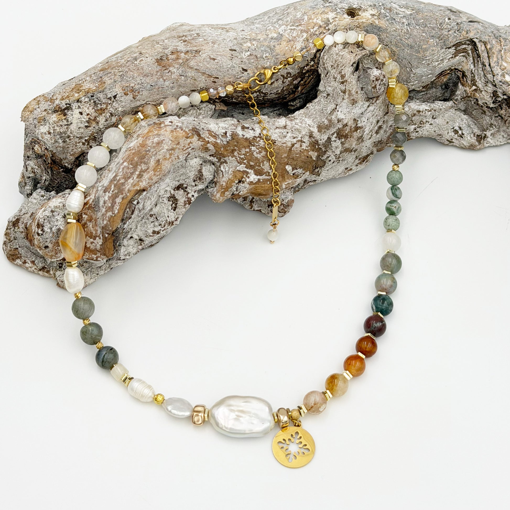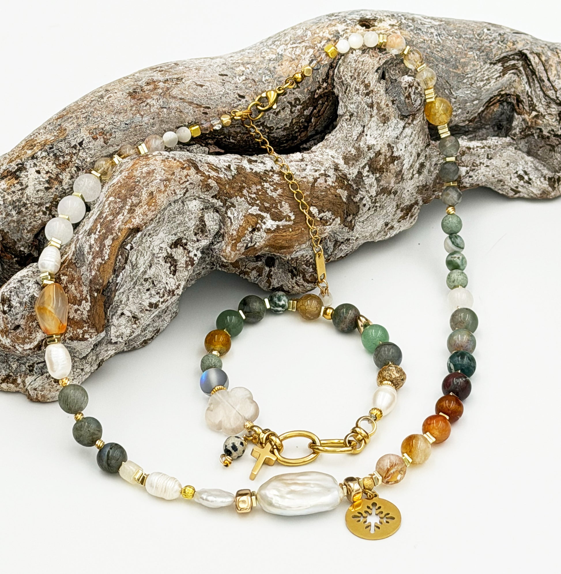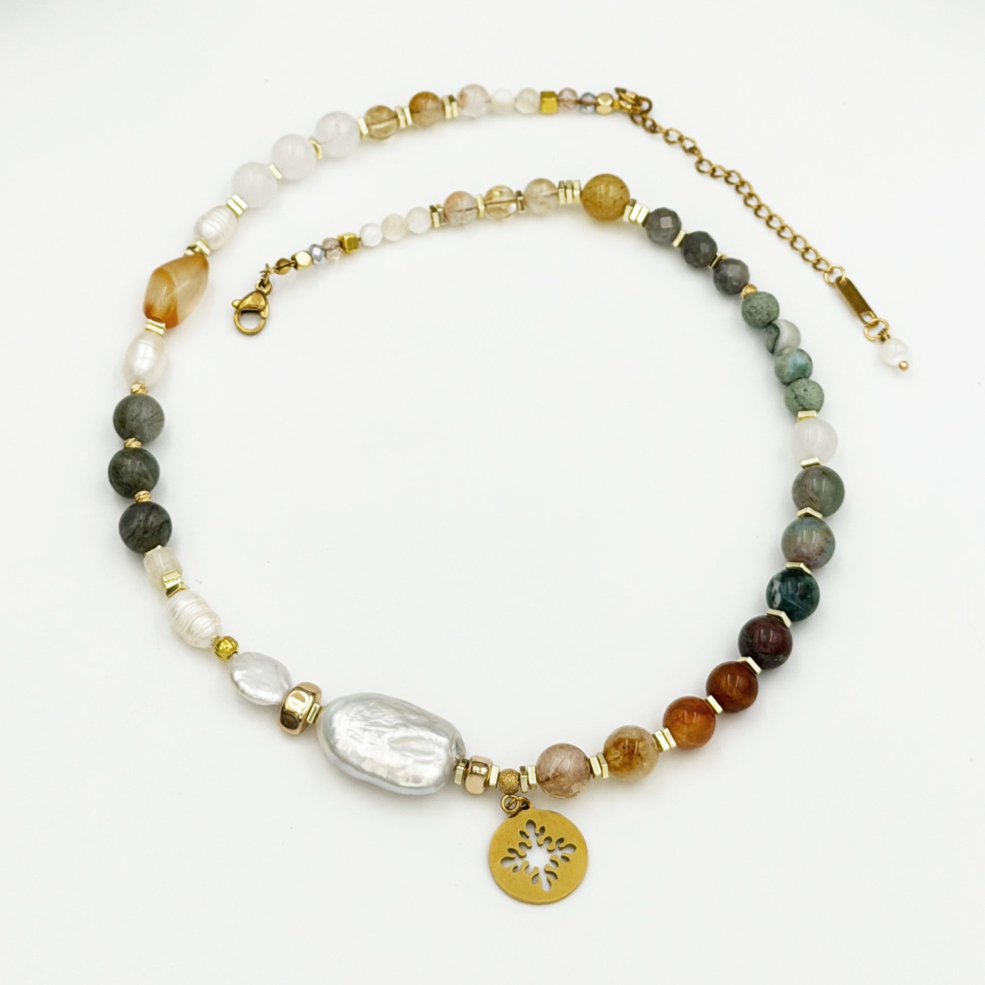 Freshwater pearls, laboradite, agate,citrin